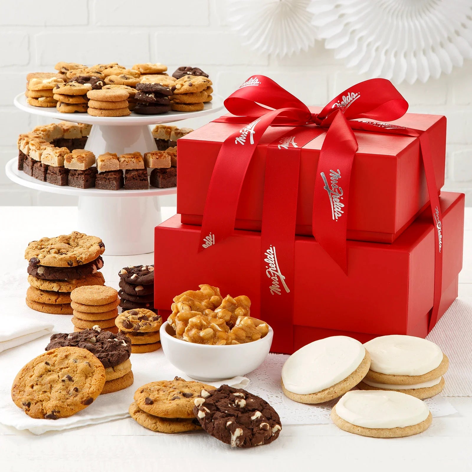 Introducing the Crimson Collection! Our new sophisticated Abundant Crimson Cookie Tower has all the best treats. Includes 16 Cookies, 72 Nibblers Nibblers® Bite-Sized, 48 Brownie Bites, 4 frosted cookies, 3 oz of peanut brittle, and 4 oz of toffee nut popcorn.