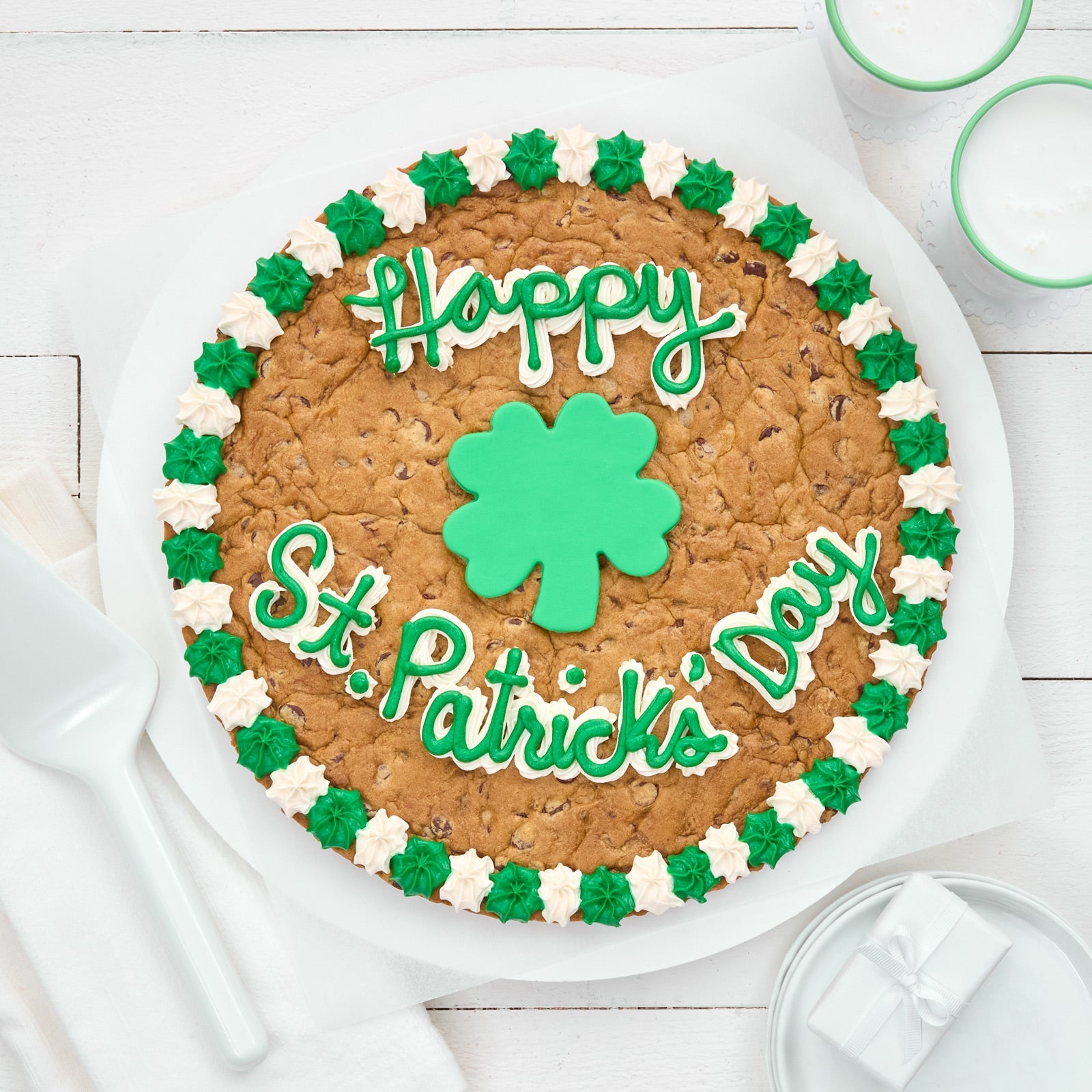 Perfect for any St. Patrick's Day celebration, our 12-inch cookie cake is decorated in buttercream frosting and perfect for sharing.